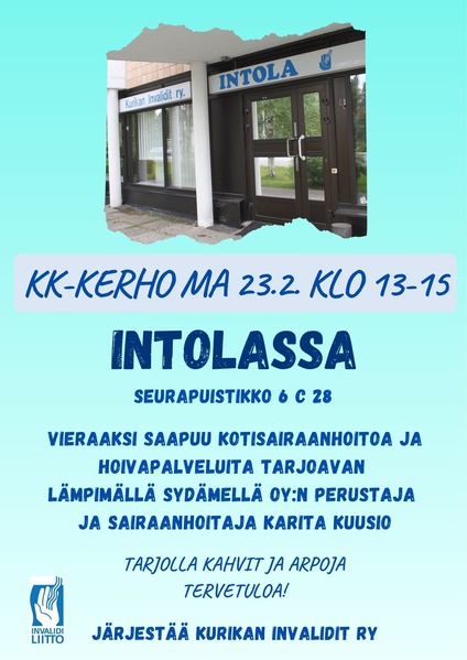 Helmikuun kk-kerho Intolassa 23.2.2026 klo 13-15.