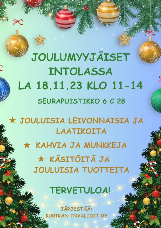 Perinteiset Joulumyyjäiset Intolassa lauantaina 18.11.2023 klo 11.00-14.00. Myynnissä jouluisia laatikoita ja leivonnaisia, käsitöitä ja jouluisia tuotteita, vaikka joululahjaksi! Myynnissä myös mm. kahvia ja munkkeja! Tervetuloa! |