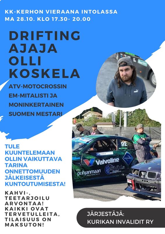 Illan kerhossa vieraana drifting ajaja Olli Koskela. ATV-motocrossin EM-mitalisti ja moninkertainen Suomen mestari mursi vakavin seurauksin kaksi selkänikamaansa v 2019. Tule Intolaan kuulemaan Ollin tarina vammautumisesta sekä kuntoutuksesta ja elämästä sen jälkeen. Tilaisuuteen ovat kaikki tervetulleita! Liitteet